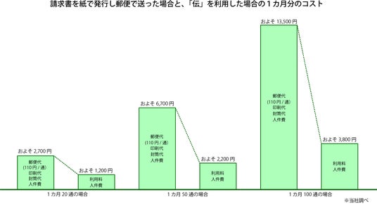 電子化した請求書や納品書などの証憑PDFを安全に送るサービス「伝」が、月々20通ほどでも郵便代を40%以上削減可能なプランの提供も始めました。