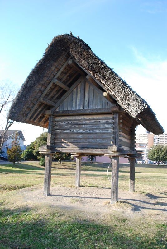 高床倉庫は、収穫した稲などを保管しておくために建てられました。湿気を防ぐために、地面から1.3mの高さに床を上げ、床と柱の間にはネズミ等の侵入を防止するための板「ネズミ返し」が挟み込まれています。遺跡内には、現在までに9棟以上の高床倉庫があったことが分かっています。