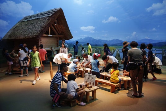 登呂遺跡の住居、高床倉庫、祭殿が約80%のスケールで縮小復元され、田植え、稲刈り、脱穀、火起こしなどの疑似体験が楽しめる体験型の展示も設置。