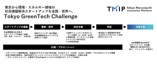 プログラム名を「東京から環境・エネルギー領域の社会課題解決スタートアップを全国・世界へ。 Tokyo GreenTech Challenge」と題し、スタートアップが最短距離で社会課題解決のインパクトを実現できるよう、 300団体を超えるTMIPコミュニティを活用し、「大企業・自治体等のプレイヤー集め」、「協調領域の抽出」、「実証費用・フィールド提供」など強力に伴走いたします。プログラムでは環境・エネルギー・気候変動分野でのスタートアップの募集をし、審査・採択した上で、TMIPコミュニティの大企業や自治体とチームを組成し、実装を見据えた実証実験などを実施します。あわせて、スタートアップの活動の紹介や広報活動も支援いたします。本プログラムにおいて、野村総合研究所は全体サポートや採択スタートアップのメンタリングや協業伴走を、グリーンタレントハブは採択スタートアップに対する人材採用支援やプロモーション支援を、トークンエクスプレスはインパクト測定及びインパクトレポートの作成を行います。