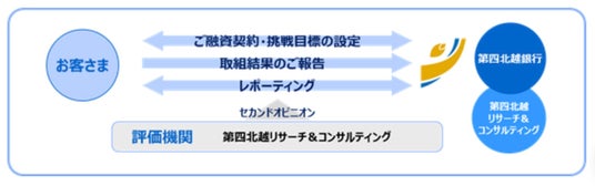 お客さまがSDGsやESGに関連するSPTsを設定し、その達成状況に応じて適用金利等が変更となる商品で、当行では2022年6月より取り扱いを開始しています。SPTsの妥当性や SDGs・ESGに関する取り組みの適切性について、第三者評価を取得するスキームとしており、第四北越リサーチ&コンサルティング 株式会社が評価を行います。なお、本ローンのフレームワークは、外部専門機関である株式会社 格付投資情報センターより「サステナビリティ・リンク・ローン原則」及び「グリーンローン及びサステナビリティ・リンク・ローンガイドライン」に対して整合的であるとの評価を取得しております。