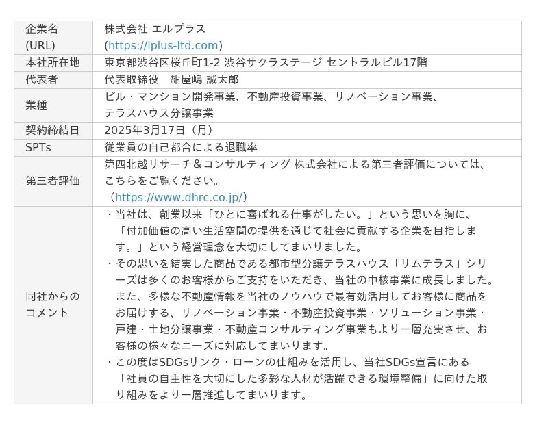 株式会社 第四北越銀行(頭取:殖栗 道郎)は、株式会社 エルプラス (代表取締役:紺屋嶋 誠太郎)と「SDGsリンク・ローン※1」(以下、「本ローン」)の契約を締結しましたのでお知らせいたします。