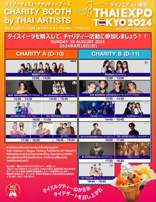 チャリティブース“Charity Booth D10-D11/ドリンク”で、タイスイーツ「タイミルクティーのかき氷」「パン・エン」を豪華アーティストから購入いただくと、収益金の一部はタイの“SOS Children's Villages Thai Foundation(https://www.sosjapan.org/sos-childrensvillages) 、また能登半島震災復興支援団体へと寄付されます。