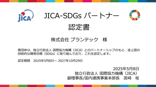 株式会社プランテック(所在:東京都千代田区、代表取締役社長執行役員 小山 直行)は、独立行政法人 国際協力機構(JICA)の「JICA-SDGsパートナー」に建築設計事務所として初めて認定されましたので、お知らせいたします。