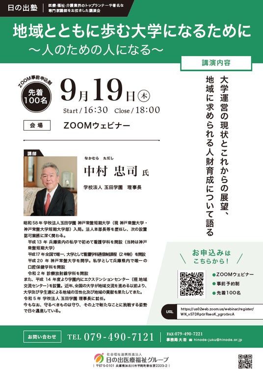 介護・保育・医療サービスを提供する社会福祉連携推進法人 日の出医療福祉グループ(所在地:兵庫県加古川市、代表理事:大西奉文)は、学校法人玉田学園 理事長 中村忠司氏によるセミナーを開催いたします。