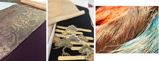 <左>ミラノコレクション発表作品に利用される「ねん金綴錦」の帯地の残布。その下にある紫地の着物は当社代表・高尾の私物で、こちらがスーツ本体に、帯が襟の部分に使用される。<中央>同じく当社提供の黒留袖と「ねん金綴錦」の帯地の残布。こちらはタキシードにアップサイクルされる。<右>当社独自の糸「ねん金糸」