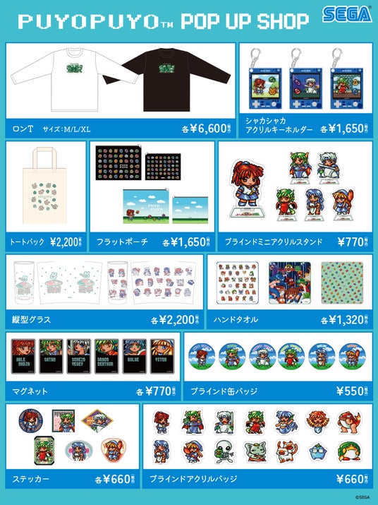 POP UP SHOP会場にてご好評いただいた『ぷよぷよ 通』など昔懐かしのドット絵キャラクターを使用した、盛りだくさんの新作グッズを受注生産にて皆様にお届けいたします。