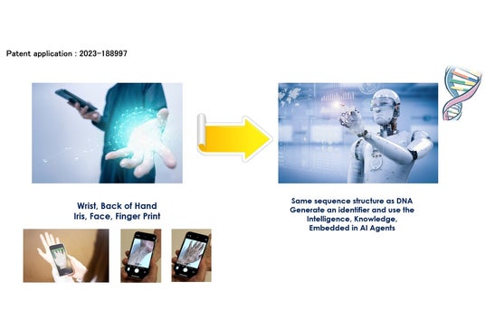 株式会社Nayutamは、手のひらの生体データからAIエージェントの知能共有に適したDNA型識別子を生成する特許を出願しています。AIの知能共有に適した識別子を生成するためには、生物の進化の過程で最適化されたDNAと同じ配列構造を持つことが最良であるという、私たちの思想から開発されたものです。