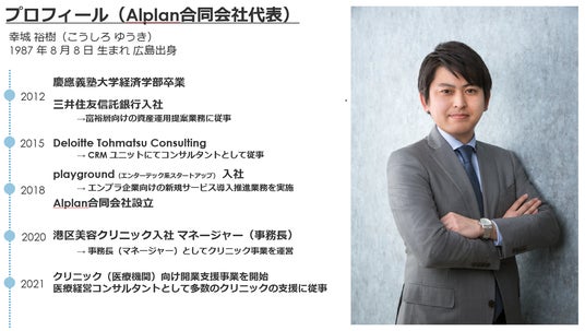 幸城裕樹氏は、Alplan合同会社の代表として、医療経営コンサルタントとしての豊富な経験を持っています。デロイトトーマツコンサルティングや三井住友信託銀行での経験を経て、医療機関の経営支援に特化したサービスを提供しています。