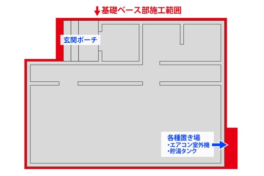 上図に赤色で示されたエリアのように、基礎の立ち上がりより外側までベース部を設けます。