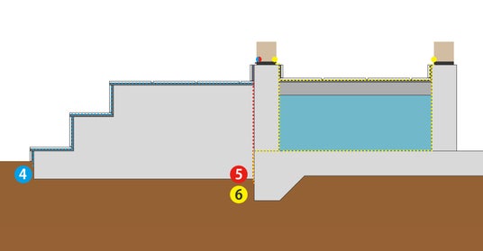 シロアリの通ることとなる天板(水色斜線エリア)には、仕上げモルタルの塗り付けは行いません。モルタルが劣化し、コンクリートから浮き上がると、その隙間をシロアリが通過してしまい、防蟻効果が低下します。