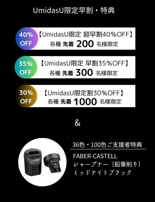 株式会社ワイズコーポレーションのグループ会社で、現存する世界最古の筆記具メーカー「ファーバーカステル」の日本発売元である株式会社フェリッティ(本社:大阪市東成区、代表取締役:室井和憲)は、新商品「BLACK EDITION色鉛筆」の日本初上陸を目指すプロジェクトを、購入型クラウドファンディング【UmidasU】で2024年9月15日(日)より受付を開始し、6時間で目標達成いたしました。10月17日現在で支援金額は230万円を超えております。