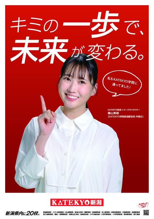 新潟県内の教室を中心に掲出予定のポスターでは、「キミの一歩で、未来が変わる。」というコピーとともに、横山さんの等身大の笑顔を採用しました。かつてKATEKYOで学んだ先輩として、受験生を励ますビジュアルに仕上がっています。