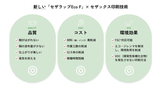セザックスの包装紙事業はオフセット(UV)印刷で包装紙を刷るため、グラビア印刷特有の希釈溶剤や臭気、CO2の大量排出がありません。少ないロットにも対応し、包装紙の在庫を抱える必要がなく、生産計画に適した数量の用紙調達が可能です。また、包装紙「セザラップ」は接着力に優れ、包装時に糊がはがれにくいコート系片面塗工紙。糊はがれによる不良品や廃棄品が低減し、ロス率や作業工数(人件費、光熱費)の削減につながります。糊自体の塗布量が少なく、接着面が美しい仕上がりを実現。無駄な材料、工数を抑え、環境への負荷とコストを低減します。また、FSC認証に対応し、より環境性能に優れた包装紙「セザラップEco F」もラインアップしております。