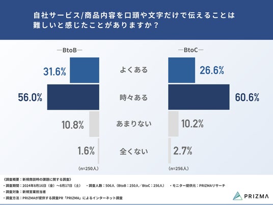 BtoB企業・BtoC企業ともに約87%の方が、「自社サービス/商品内容を口頭や文字だけで伝えることは難しいと感じたことがある」
