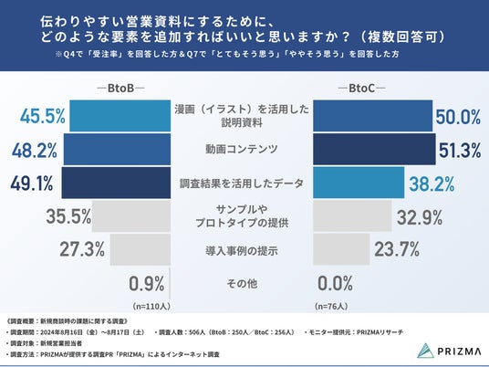 それでは、伝わりやすい営業資料にするためにはどのような要素を追加すれば良いか聞いたところ、BtoB企業は「調査結果を活用したデータ」、BtoC企業のは「動画コンテンツ」が最も多く挙げられました。