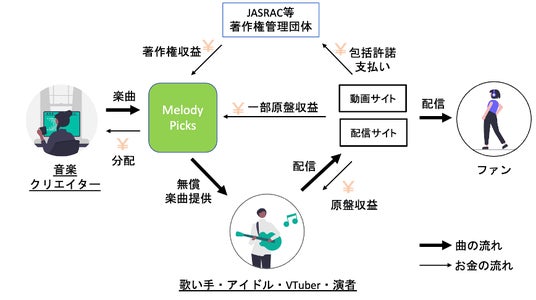 音楽クリエイターはMelodyPicksに楽曲を提供することで、収益を得る機会を増やすことができ、楽曲製作者を探している依頼者はMelodyPicksをチェックすれば様々な音楽クリエイターを知ることができ、歌い手等の動画投稿者はMelodyPicksによって許諾等の手続き不要で自身のレパートリーを増やすことができます。