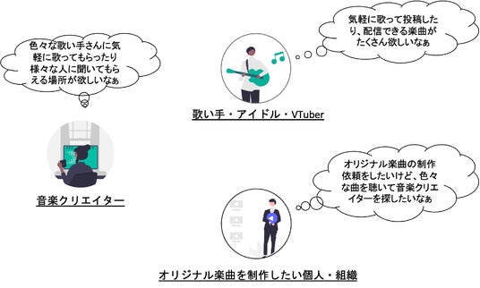 近年、YouTubeやニコニコ動画と言った動画投稿サイト、ディストリビューションサービス、サブスクリプションサービス等の充実により、個人で音楽活動を続けながら収益を上げる機会が益々増えています。しかし、個人の活動には時間や資金、能力等様々な部分で限界も多く、楽曲利用者と出会う場も限定されており、安定した収益を上げる段階にたどり着くまでに多くの壁が存在します。