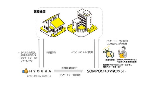 SOMPOリスクマネジメント株式会社(本社:東京都新宿区、代表取締役社長:中嶋 陽二、以下「SOMPOリスク」)と株式会社Datailo(本社:東京都港区、代表取締役:Aki Kutvonen、以下「Datailo」)は、顧客インサイトを収集するタブレット型アンケートシステム「HYOUKA」の紹介協定(以下「本協定」)を締結しました。SOMPOリスクは、自社のネットワークを活用してDatailoの「HYOUKA」を医療機関へ紹介し、「HYOUKA」を導入した医療機関に対し、「HYOUKA」で収集したデータに基づき、サービス向上を支援します。