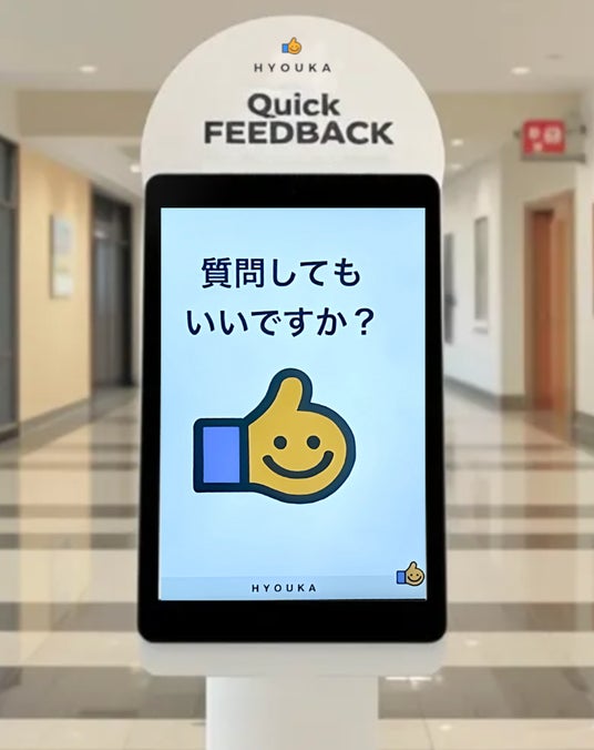 「HYOUKA」は、回答状況や、タブレット内蔵のAIカメラが測定した回答者の性別・年代に応じて質問内容を変更できるため、効率的にデータ収集ができ、具体的な改善策につながる質の高いインサイトの調査結果を得ることが可能です。また、タブレットに表示される質問に対し、ジェスチャーや画面タップで回答できる仕様となっており、楽しみながら負担なくアンケートに参加できるため、高い回答率が期待できます。
