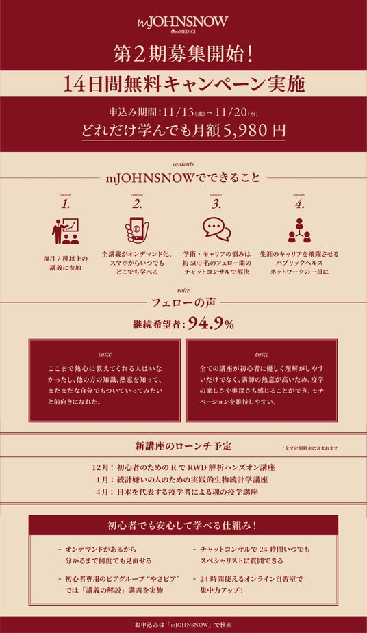 mMEDICI株式会社(代表取締役:廣瀬 直紀、以下「当社」)は、2024年10月よりヘルスケア人材が研究手法を学ぶためのオンラインスクールmJOHNSNOWをローンチしました。初回のフェロー募集では1週間で500名超のスペシャリストが参加し、医師200名、企業研究者110名など、全世界から産官学にわたってヘルスケアのスペシャリストが集う日本最大級のヘルスケアオンラインスクールとなっています。さらにローンチから2ヶ月間で退会者はたった1名のみ、満足度の高い運営を行ってきました。