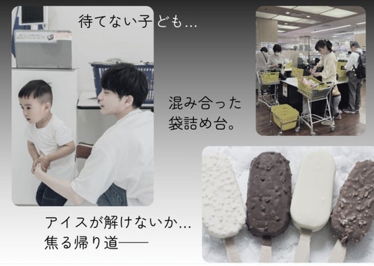 会計後の袋詰めを待てず、ぐずり出す2~3歳の子ども。