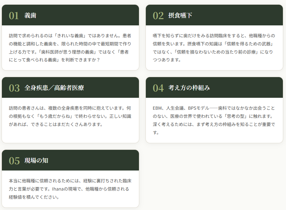 単なるスキルアップに留まらず、他職種から信頼される歯科医師を育成するため、以下の5つの領域を統合した実践型カリキュラムを提供します。