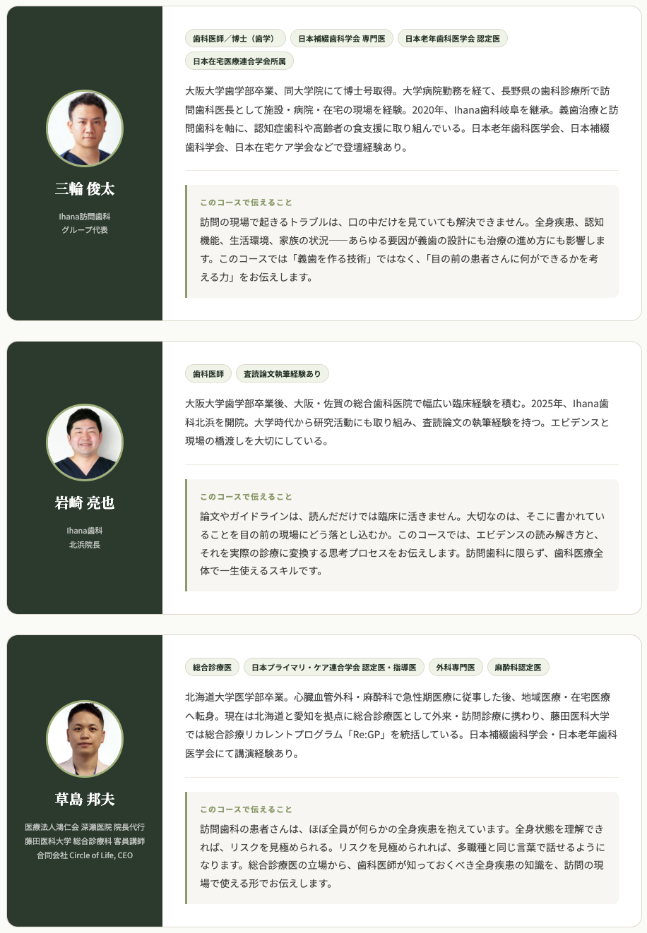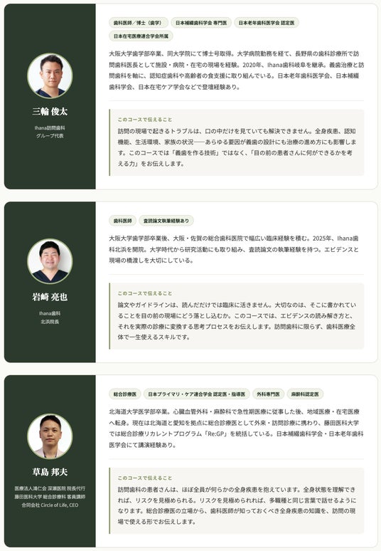 目の前の患者さんは認知症で、全身疾患があり、家族も不安を抱えている。口の中だけ見ていても何も始まらない。「ちゃんとした訪問歯科」を求め、施設や在宅で何年もかけて向き合って見えてきた答えを、このコースに込めました。