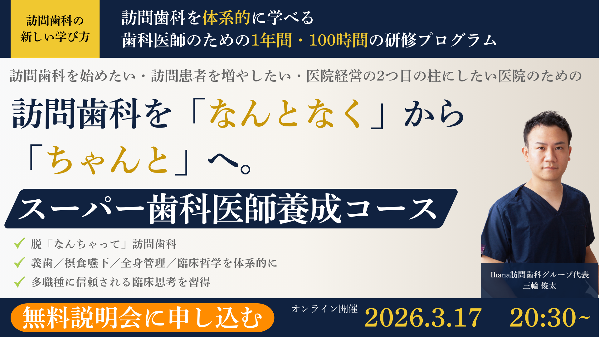 ・対象: 訪問歯科を強化したい院長、体系的に学びたい歯科医師、地域医療に関心の高い方