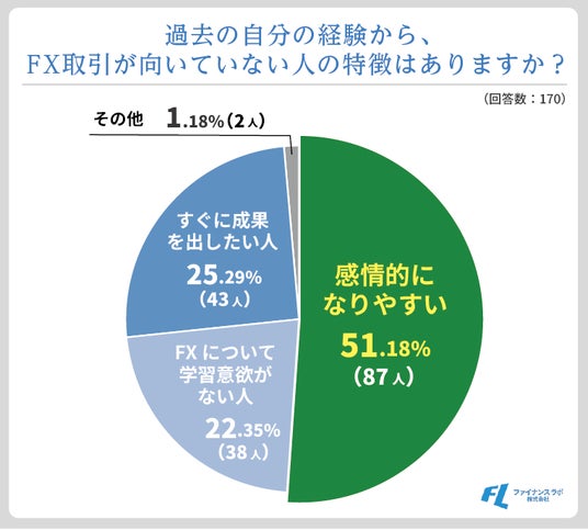 今回「過去の自分の経験から、FX取引が向いていない人の特徴はありますか?」と質問したところ、約51%の人が「感情的になりやすい人」と回答しました。