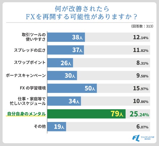 また同じく過去にFX取引をしていた人に対して「何が改善されたらFXを再開する可能性がありますか?」と質問したところ、約25%の回答が「自分自身のメンタル」でした。