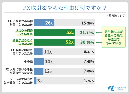 株式会社ファイナンスラボ(所在地:東京都渋谷区、代表:杉山諒也)はFX取引経験者を対象にした「FX取引をやめてしまった理由」に関する調査を実施しました。