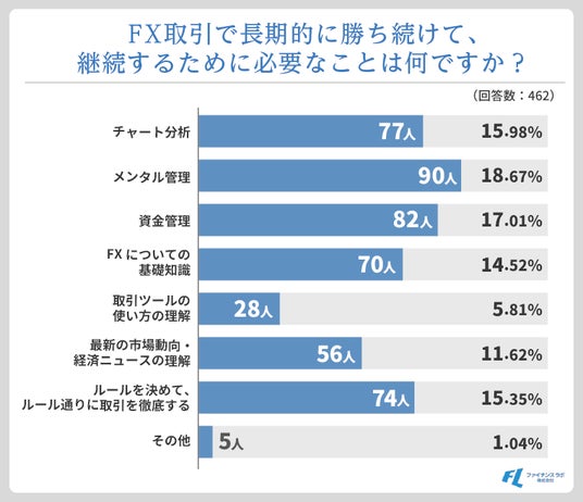 「FX取引で長期的に勝ち続けて、継続するために必要なことは何ですか?」と聞いたところ、約18%の人が「メンタル管理」約17%の人が「資金管理」約16%の人が「チャート分析」約15%の人が「ルールを決めて、ルール通りに取引を徹底する」と回答していました。
