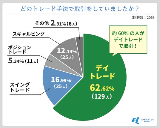 アンケートで「どのトレード手法で取引をしていましたか?」と聞いたところ、「デイトレード」と回答した人が約62%と一番多い結果になりました。