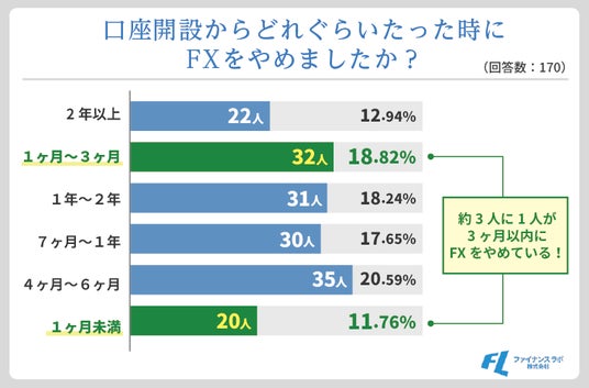 今回のアンケートで「 口座開設からどれぐらいたった時にFXをやめましたか?」と質問したところ、約30%の人が3ヶ月以内で辞めていました。