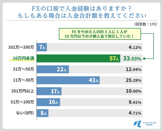 アンケートで「FXの口座で入金経験はありますか?もしある場合は入金合計額を教えてください。」と質問したところ、約33%の人が10万円以上の入金経験がないことが分かりました。