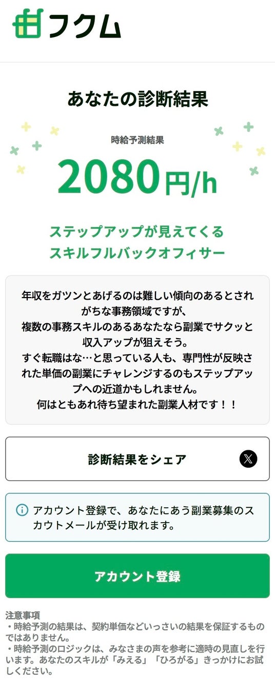 簡単にスキルを登録するだけでAIが時給を診断する機能も用意されています。