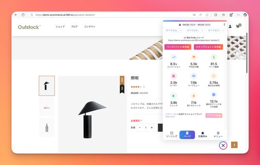 分析したいページで分析基盤を開けるだけで、そのページのパフォーマンスを理解できる機能です。