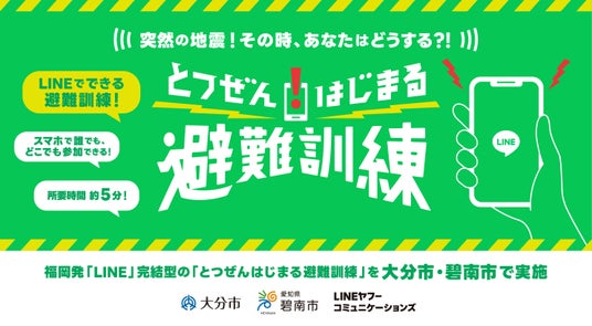 LINEヤフーコミュニケーションズ株式会社(本社:福岡市博多区、以下当社)は、大分県大分市、愛知県碧南市と協働し、コミュニケーションアプリ「LINE」(以下、「LINE」)の機能を活用したオンライン避難訓練「とつぜんはじまる避難訓練」を実施します。