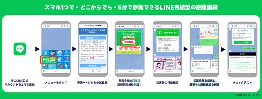 本訓練は、従来の避難訓練のように決められた日時・場所で行われる訓練とは異なり、「LINE」で手軽にどこからでも参加できる避難訓練です。事前の参加登録を行った市民に、地震を想定した避難訓練開始の通知が、予告なしで市のLINE公式アカウントに届きます。