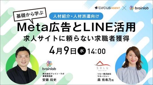 ソルー株式会社(本社:東京都)は、株式会社ブレイン・ラボ(本社:東京都)、circus株式会社(本社:東京都)とともに、2025年4月9日(水)に人材派遣・紹介会社向けの無料オンラインセミナー「求人検索サイトに頼らない採用戦略!Meta広告の基礎とLINE活用で求職者を獲得する方法」を共催いたします。