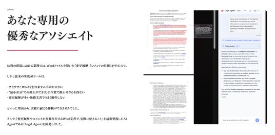 当社代表の朝戸(弁護士)は、企業法務の最前線で多数の契約書レビュー・修正に携わる中で、既存サービスでは満足できず、「変更履歴やコメントが多数存在するWord文書で、実際に使えること」を最重要要件として、「Legal Agent」を開発しました。