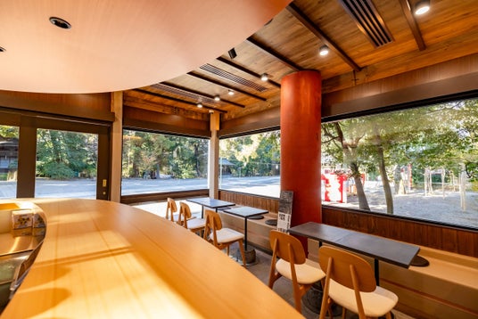 天気の良い日はテラス席も外にはテラス席もあり、氷川神社の美しい庭園を眺めながら、リラックスしてお飲み物を楽しむことができます。