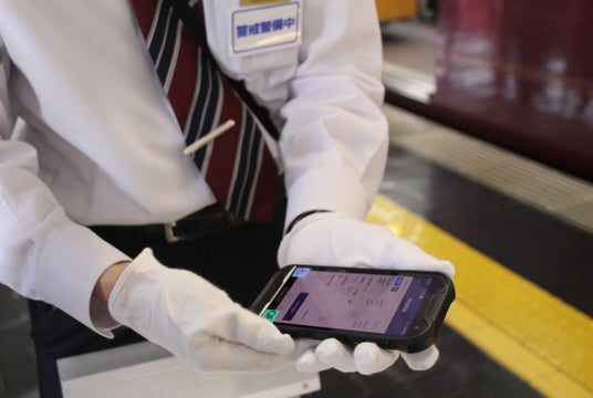 阪急電鉄の駅係員がTransreportの駅係員向け支援システムを使用中の様子
