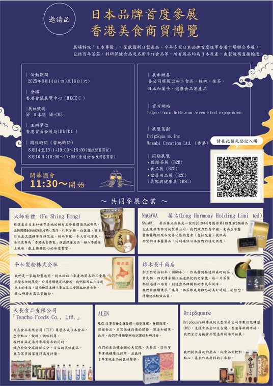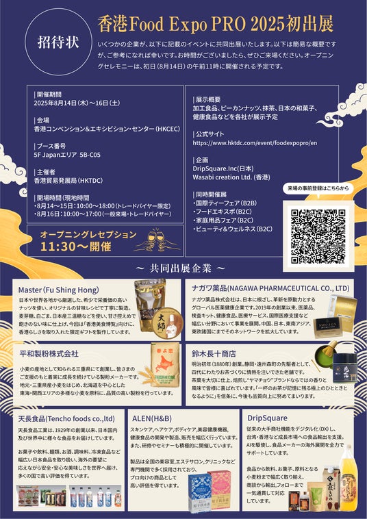 2025年8月6日、輸出支援を行う株式会社DripSquare(本社:東京都、代表:横田 英里、以下「DripSquare」)は、香港にてマーケティング・コミュニケーション領域のコンサルティングを展開するWasabi Creation Limited(本社:香港、代表:Ruby Wan、以下「Wasabi Creation」)と業務提携を締結したことをお知らせいたします。両社は2025年8月14日から16日まで開催される「香港FoodExpoPro2025」に共同出展し、これが両社のビジネスとしての協力の第一歩となります。