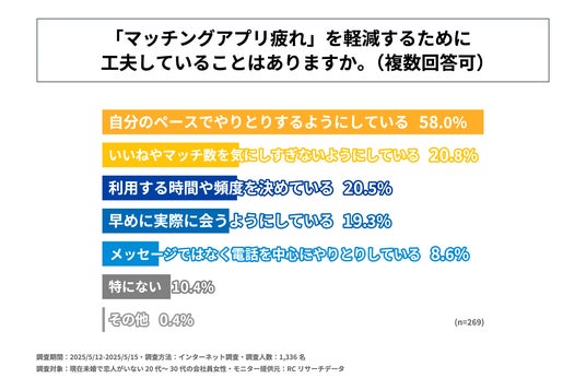 調査の最後、現在マッチングアプリを利用していると回答された方に「『マッチングアプリ疲れ』を軽減するために工夫していることはあるか」を尋ねる設問への回答では、1位が「自分のペースでやりとりするようにしている」で58.0%、2位が「いいねやマッチ数を気にしすぎないようにしている」で20.8%、3位が「利用する時間や頻度を決めている」で20.5%という結果になりました。この結果から「自分のペースでやりとりする」ことで、「マッチングアプリ疲れ」を軽減するように工夫している人が多いことが判明しました。