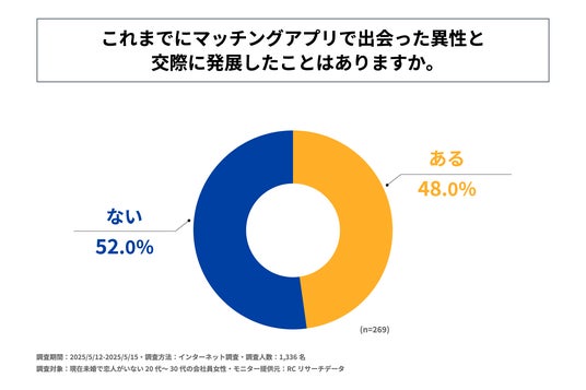 続いて、現在マッチングアプリを利用していると回答された方に「これまでにマッチングアプリで出会った異性と交際に発展したことはあるか」を尋ねる設問への回答では、「ない」が52.0%、「ある」が48.0%という結果になりました。この結果から、約半数の人がマッチングアプリで出会った異性と交際に発展した経験がないことが判明しました。