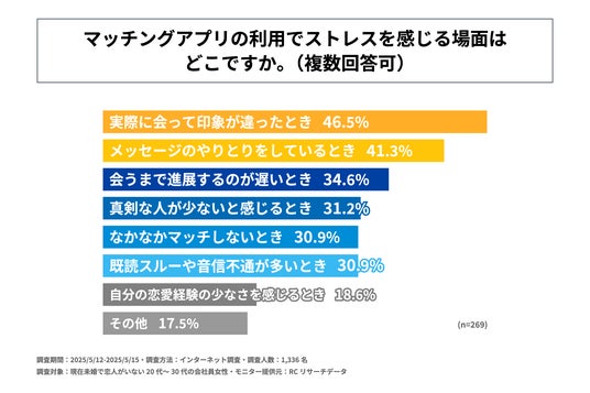 次に、現在マッチングアプリを利用していると回答された方に「マッチングアプリの利用でストレスを感じる場面はどこか」を尋ねる設問の回答では、1位が「実際に会って印象が違ったとき」で46.5%、2位が「メッセージのやりとりをしているとき」で41.3%、3位が「会うまで進展するのが遅いとき」で34.6%という結果になりました。また、4位以降も回答率30%を超える回答が複数並ぶ形となり、この結果からマッチングアプリの利用でストレスを感じる場面は様々あることがわかりました。