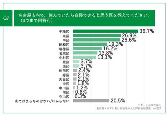 「Q7.名古屋市内で、住んでいたら自慢できると思う区を教えてください。(3つまで回答可)」(n=327)と質問したところ、「千種区」が36.7%、「東区」が26.9%、「中区」が26.6%という回答となりました。