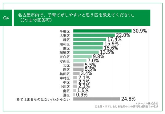 「Q4.名古屋市内で、子育てがしやすいと思う区を教えてください。(3つまで回答可)」(n=327)と質問したところ、「千種区」が30.9%、「名東区」が22.0%、「緑区」が17.4%という回答となりました。
